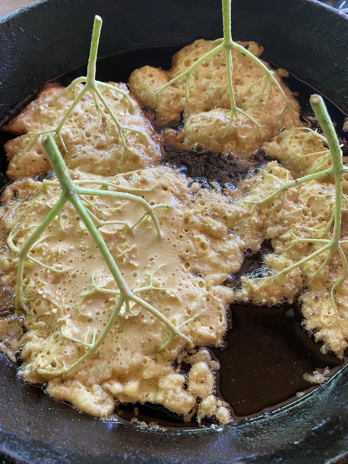 Die nur abgeschüttelten und gesäuberten Blütendolden in den Teig tauchen, kurz abtropfen lassen und im heißen Fett goldgelb ausbacken. Auf Küchenrolle „entfetten“, anschließend in Zimt/Zucker tauchen und mit Kompott oder ohne Zucker mit Hüttenkäse servieren - viel Erfolg!