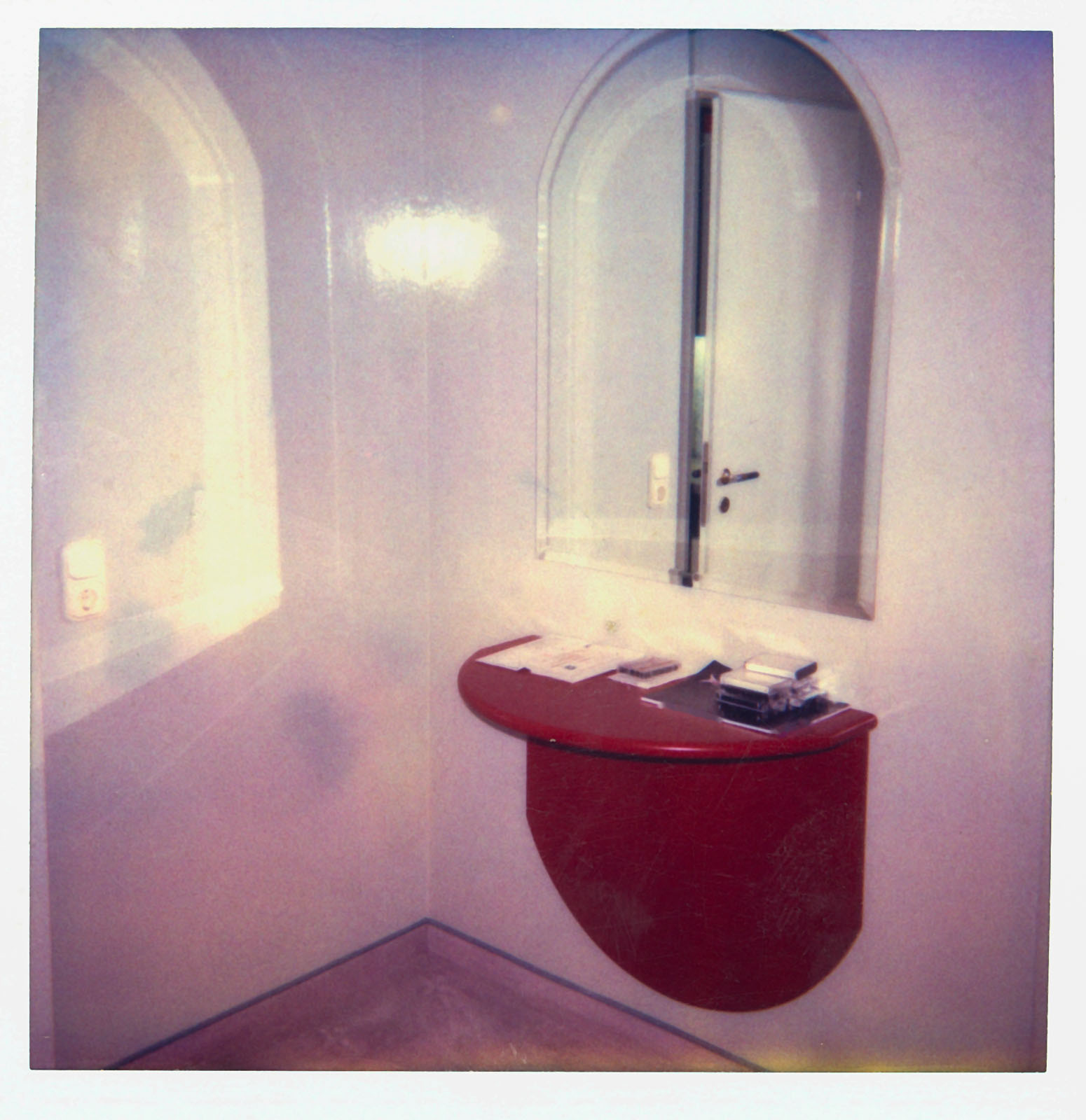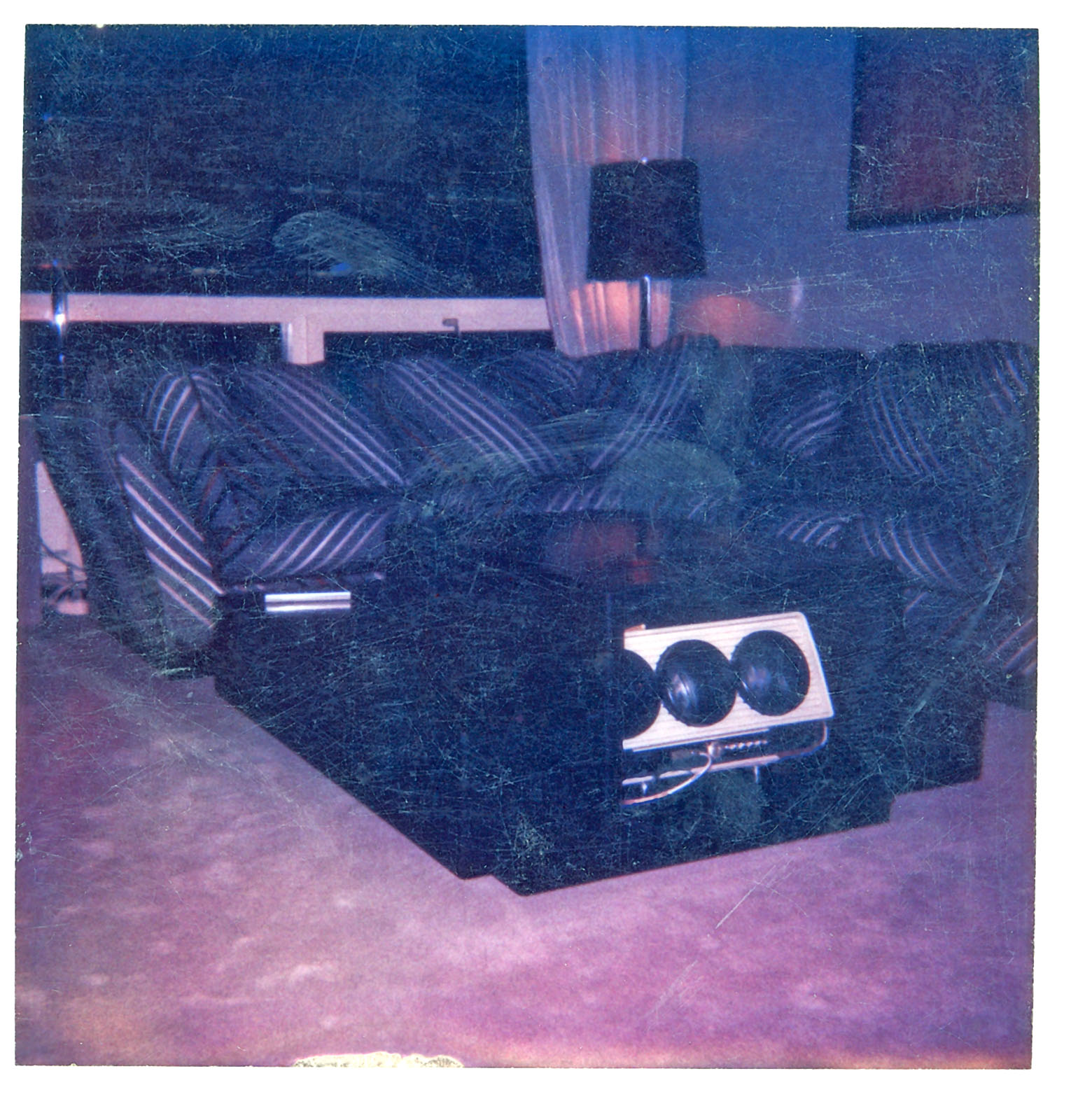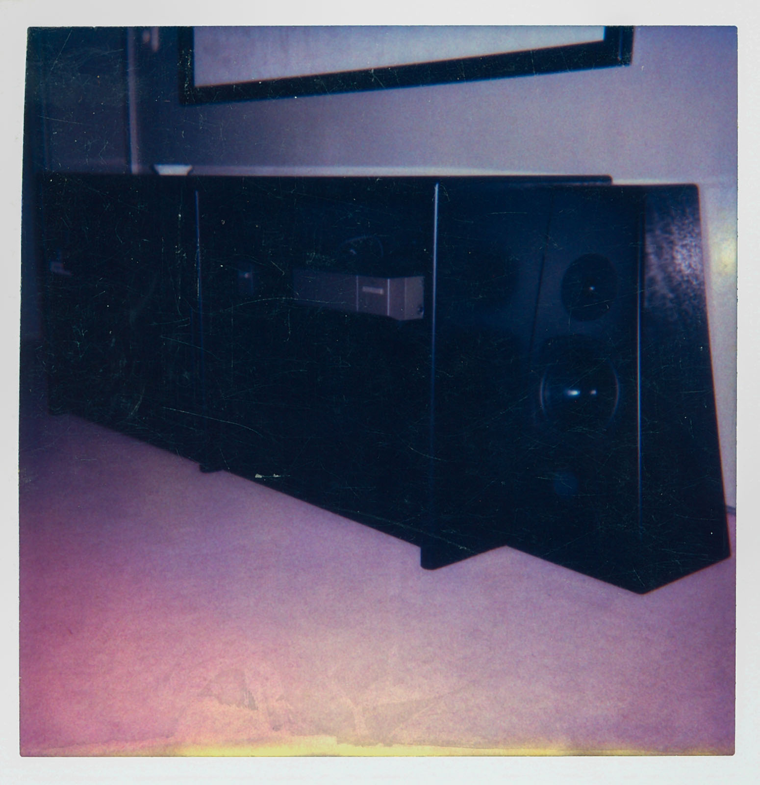 schwarzer Schleiflack - Plexiglas - Spiegel und "angelehnte" Boxen, Couchtisch mit dem darin eingebauten RGB-SONY-Projektor VPH 722QM und Videoleinwand