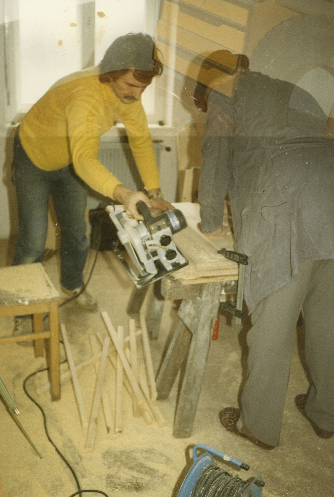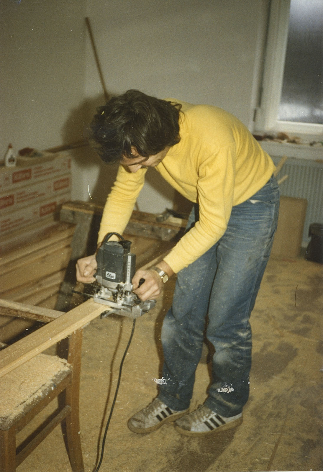 Alles wurde in der entkernten Wohnung in Marktredwitz produziert, zugesägt, Profile angeleimt und gefräst, gebeizt, lackiert und mit Beschlägen versehen.