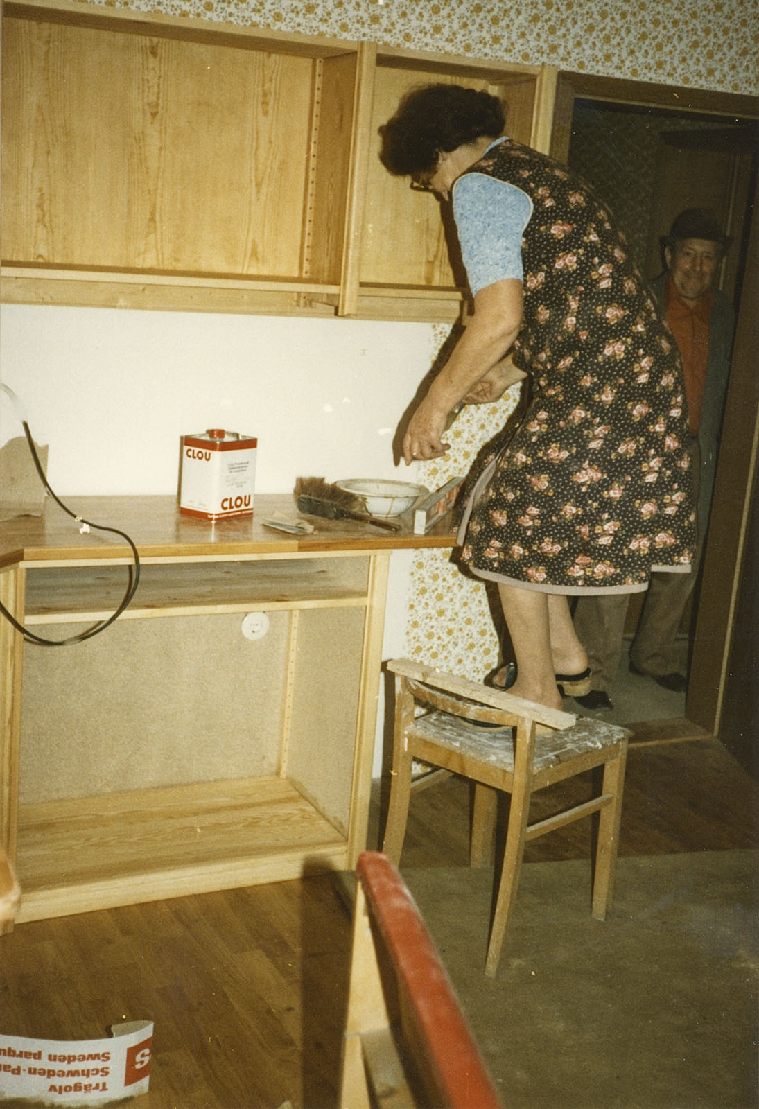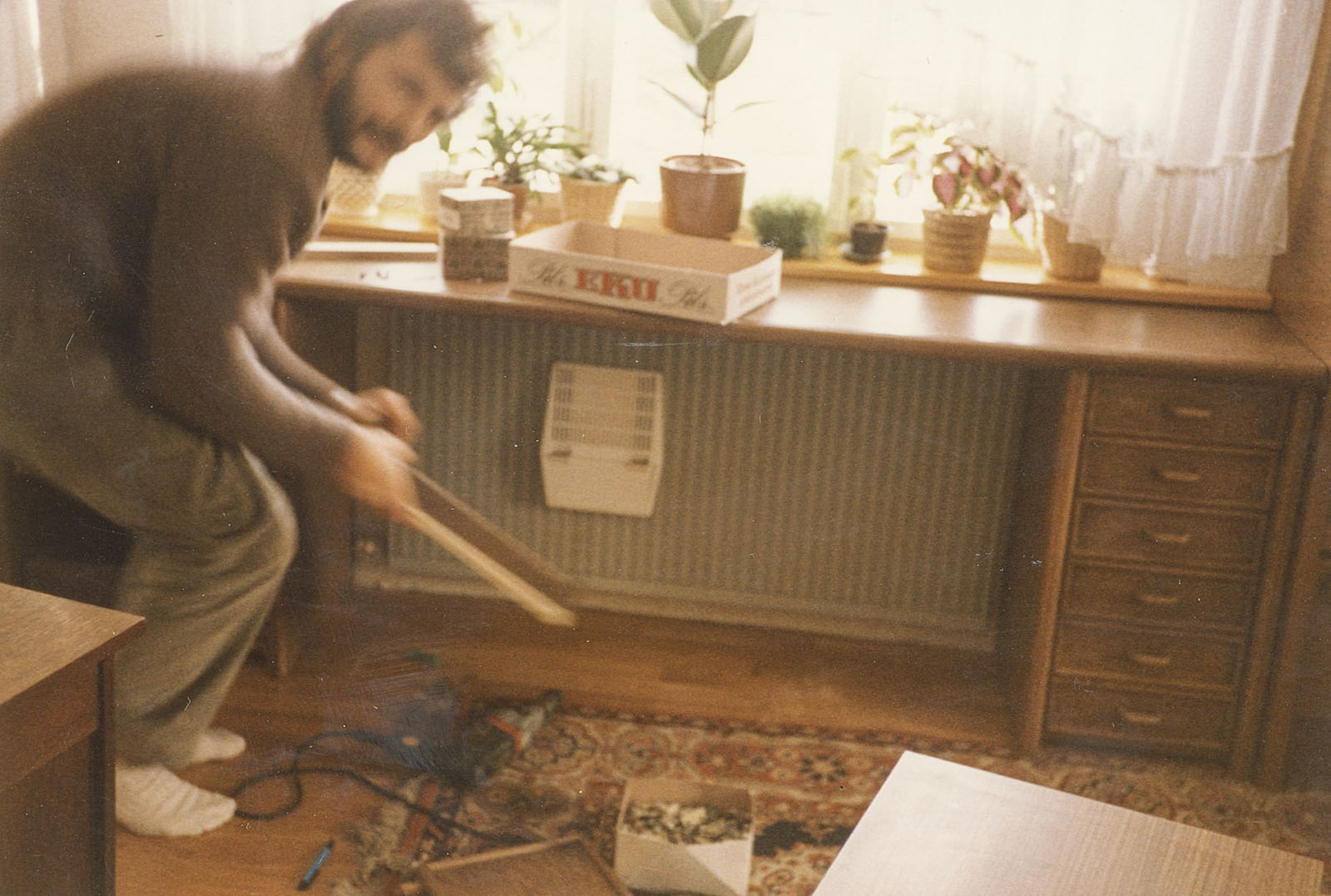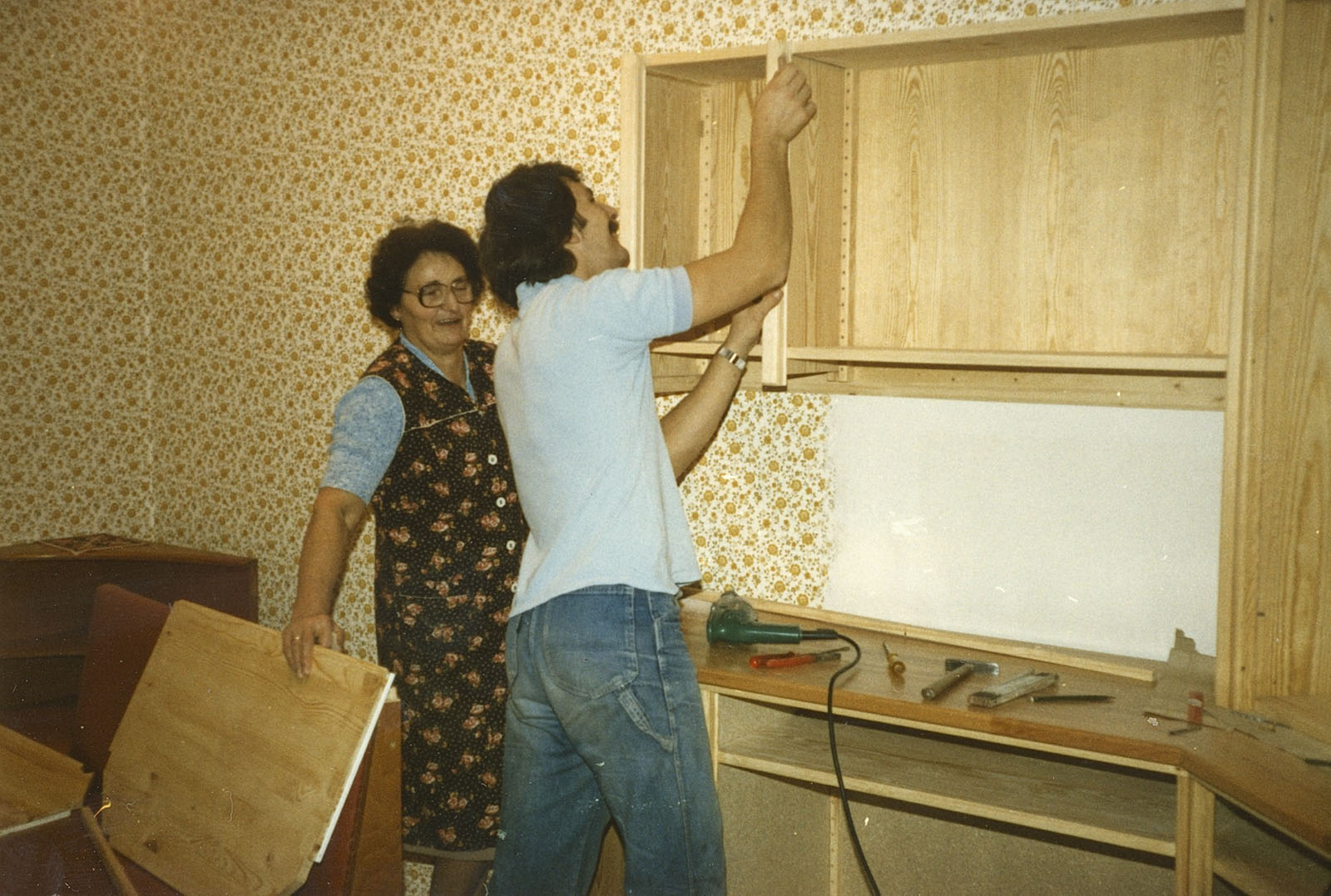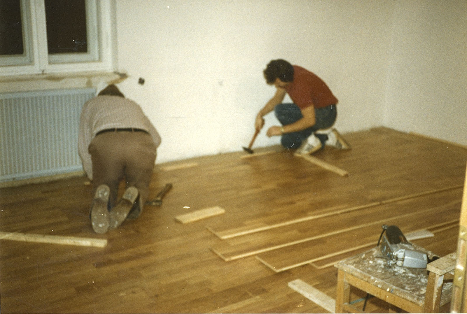 Dennoch wurde die Wohnung entkernt, Parkett gegenüber beim Profi-Markt besorgt, auch Türen und diverse Leisten. Bei IKEA hatte ich IVAR-Regale gekauft, die zerlegt wurden, genutet und mit 8 mm Füllungen versehen. In Schwabing hatte ich schon diese Teile und die Fronten mit Kiefer und Ponal furniert, gepresst zwischen Zinkplatten mit Leisten und Zwingen und schweren Blumentöpfen.