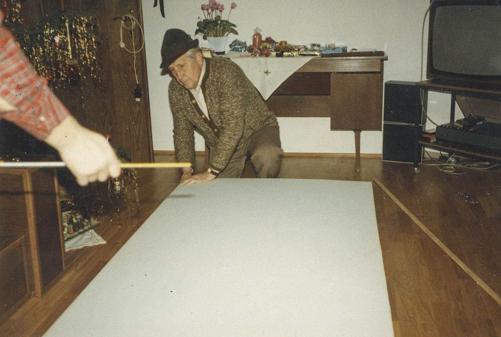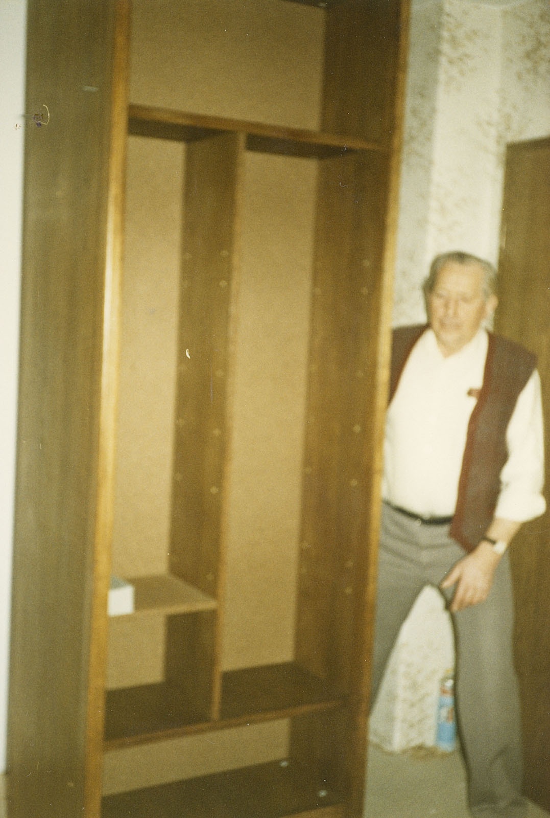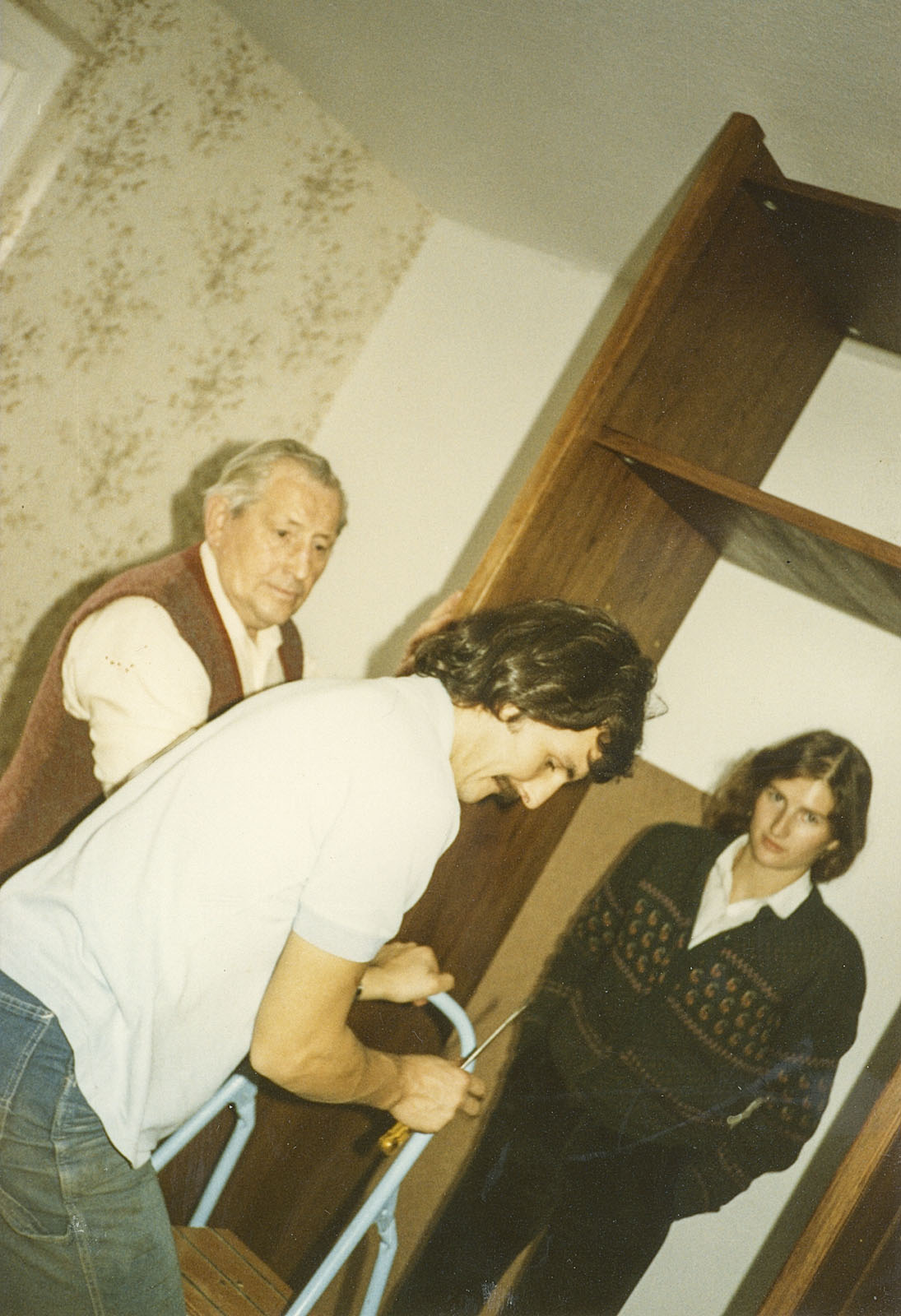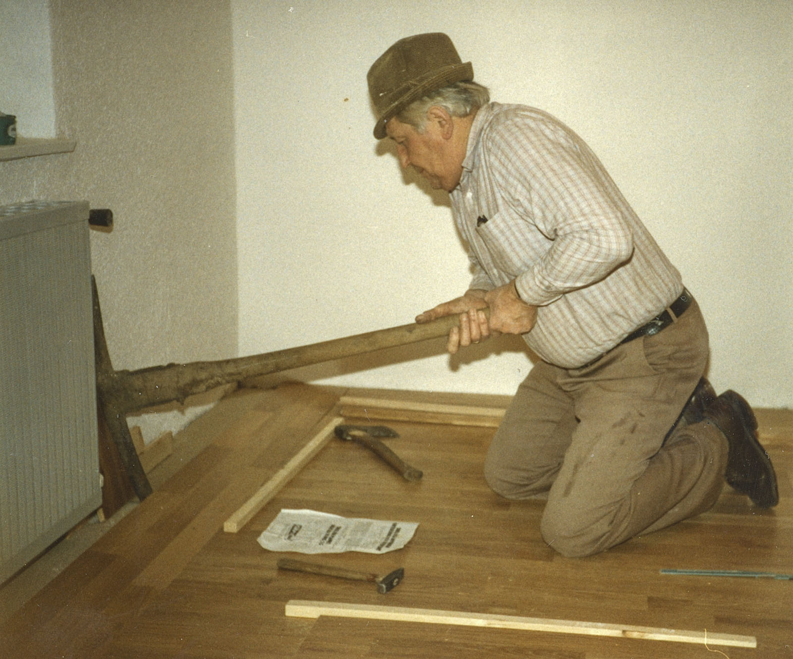Dennoch wurde die Wohnung entkernt, Parkett gegenüber beim Profi-Markt besorgt, auch Türen und diverse Leisten. Bei IKEA hatte ich IVAR-Regale gekauft, die zerlegt wurden, genutet und mit 8 mm Füllungen versehen. In Schwabing hatte ich schon diese Teile und die Fronten mit Kiefer und Ponal furniert, gepresst zwischen Zinkplatten mit Leisten und Zwingen und schweren Blumentöpfen.