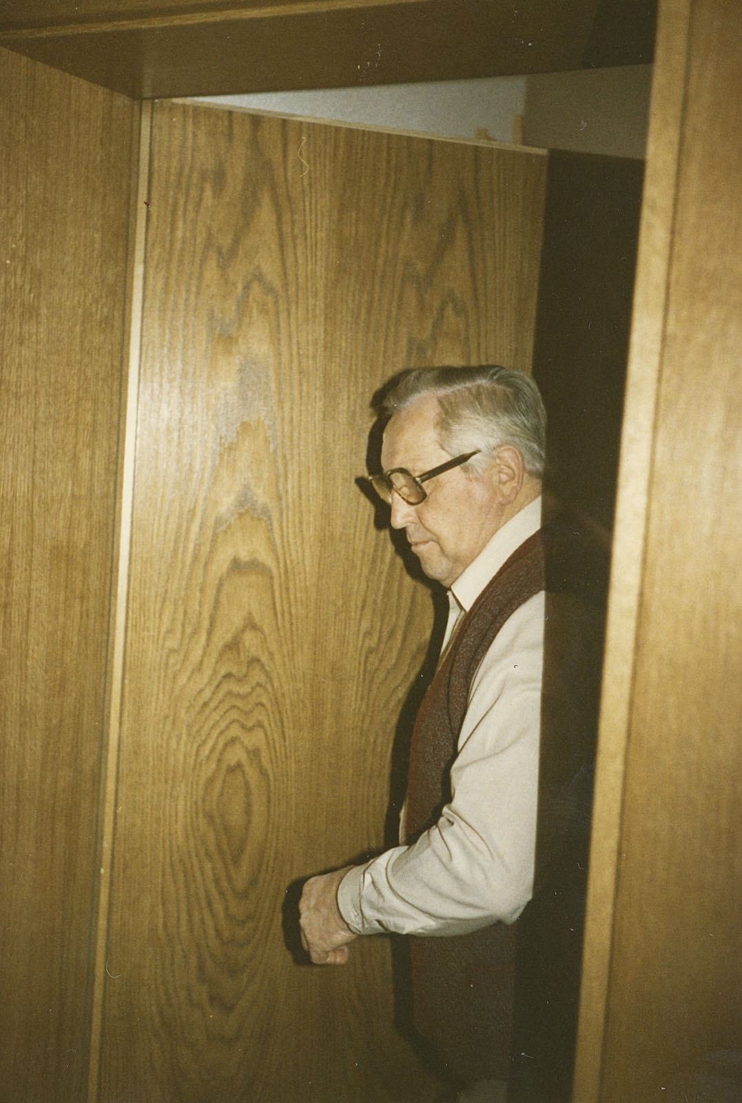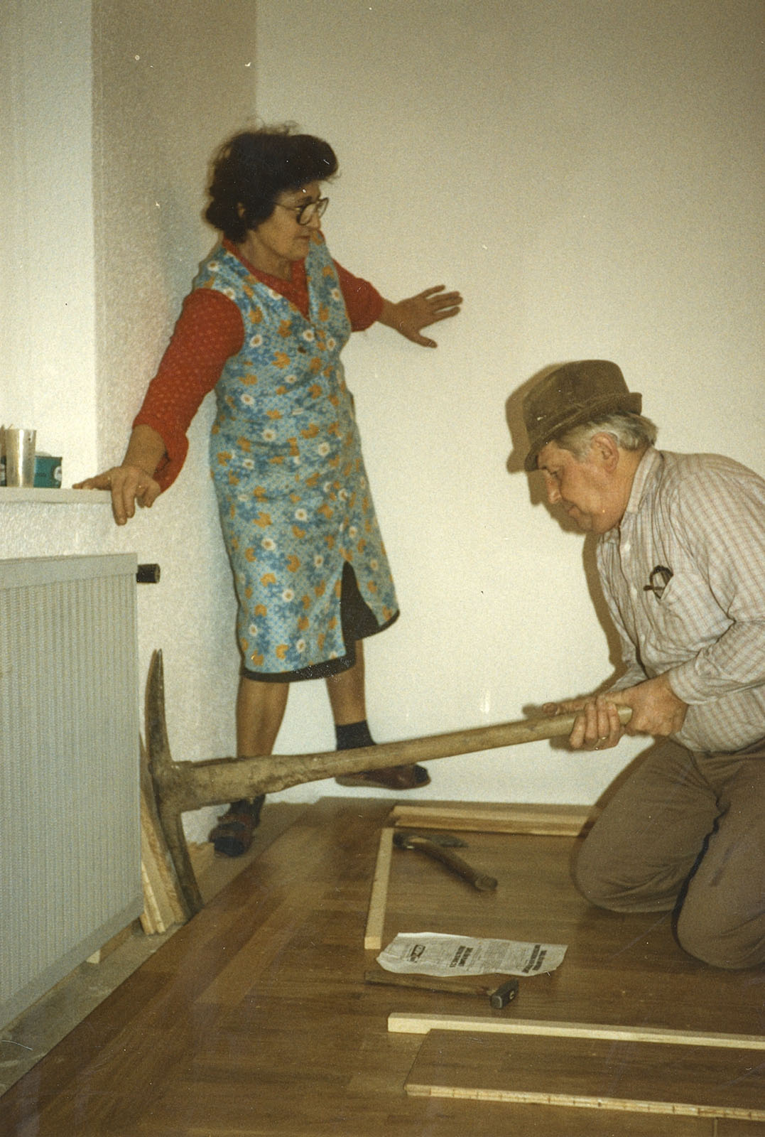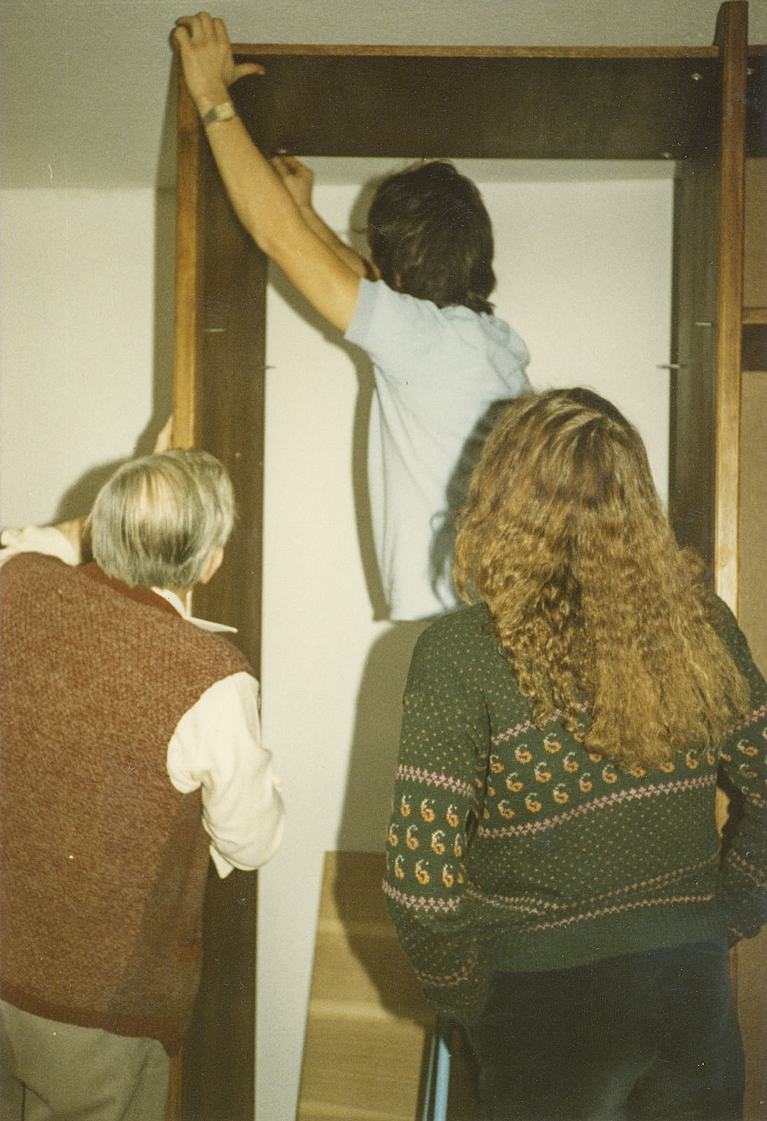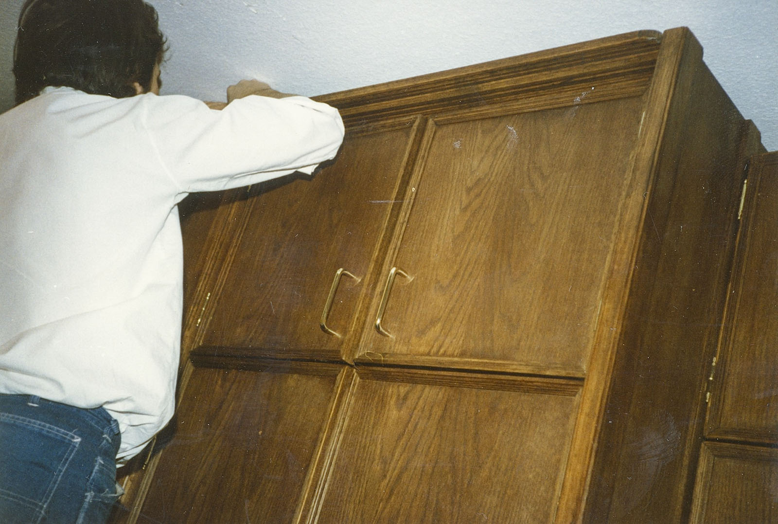 Dennoch wurde die Wohnung entkernt, Parkett gegenüber beim Profi-Markt besorgt, auch Türen und diverse Leisten. Bei IKEA hatte ich IVAR-Regale gekauft, die zerlegt wurden, genutet und mit 8 mm Füllungen versehen. In Schwabing hatte ich schon diese Teile und die Fronten mit Kiefer und Ponal furniert, gepresst zwischen Zinkplatten mit Leisten und Zwingen und schweren Blumentöpfen.