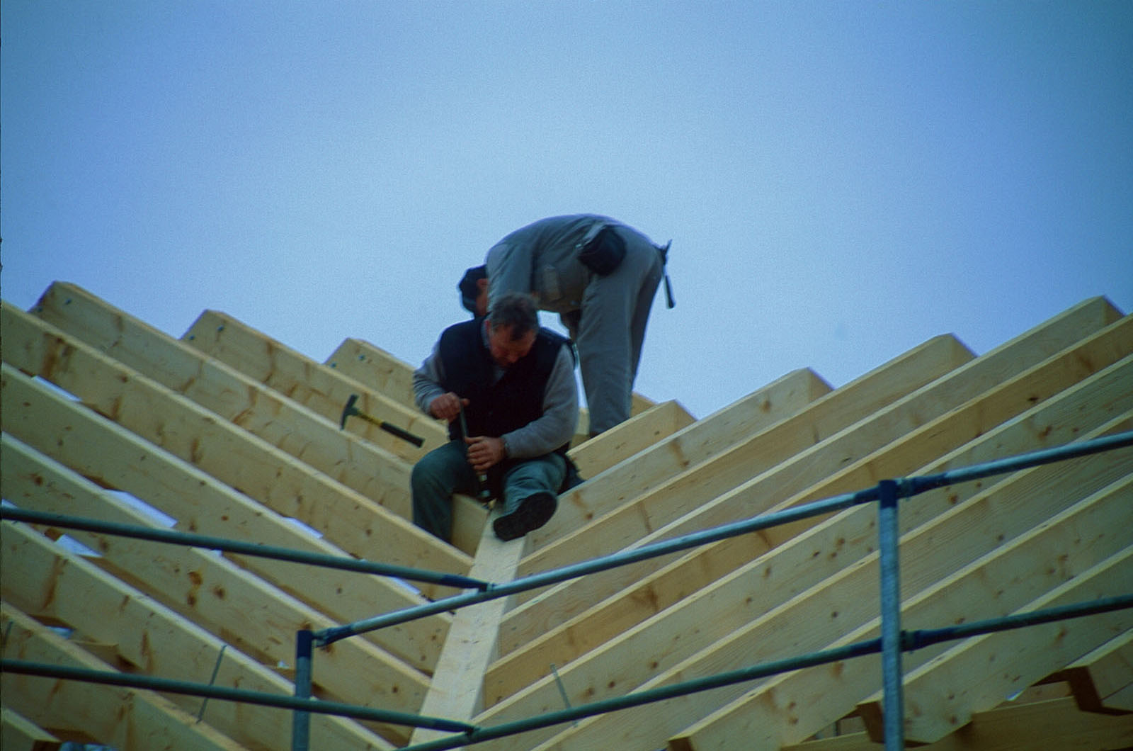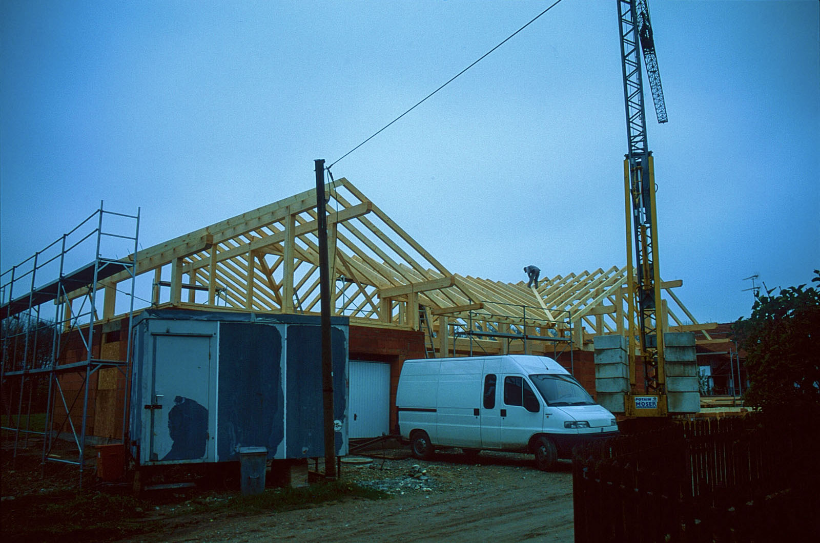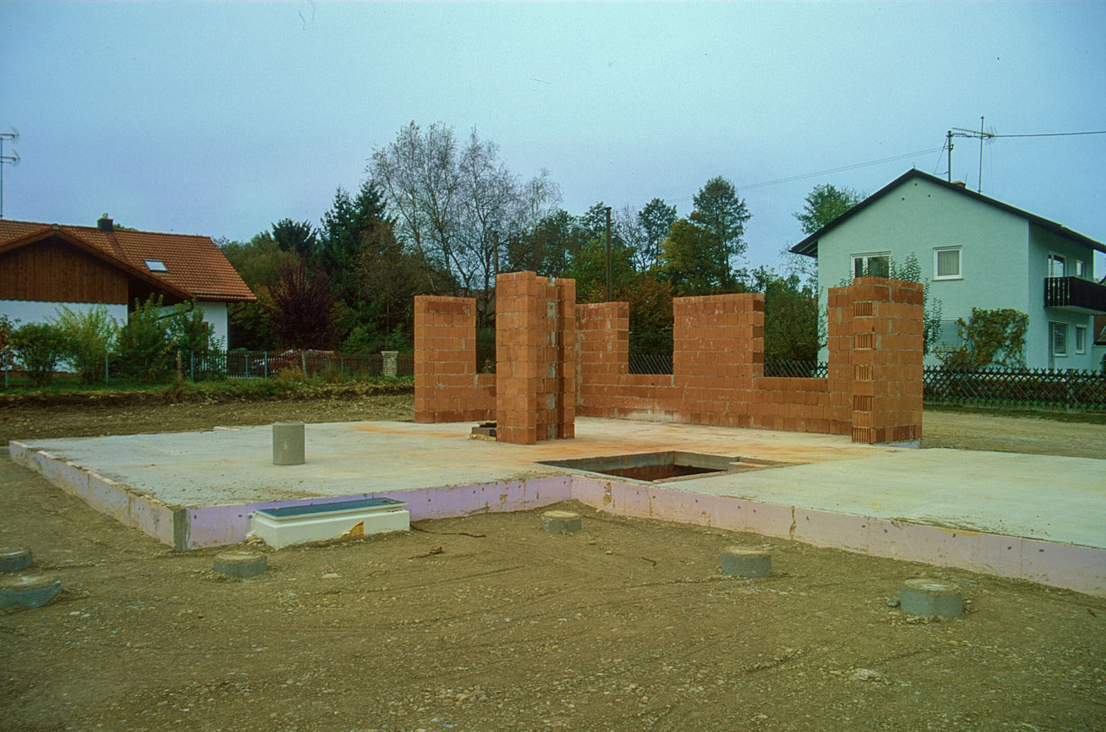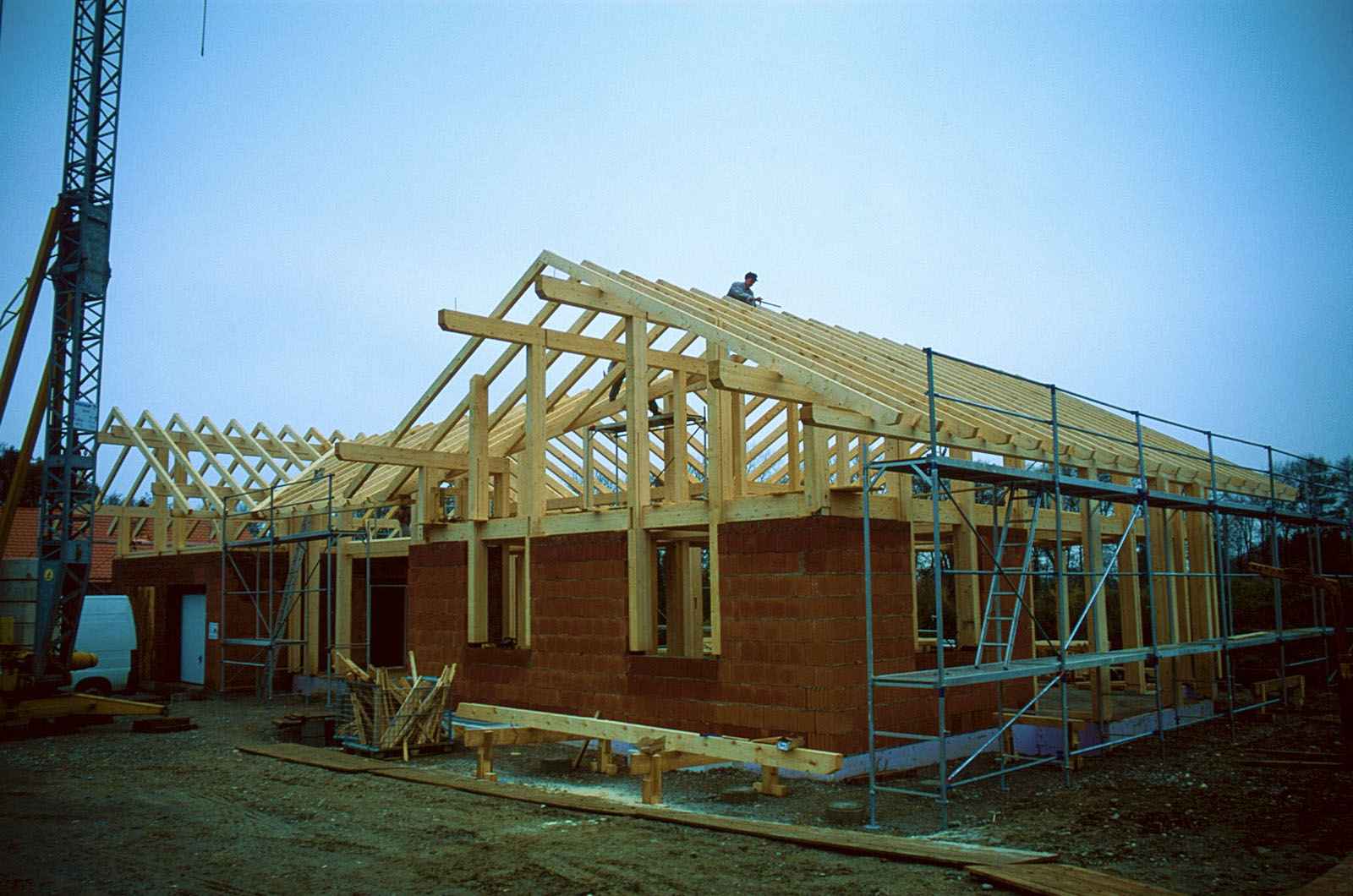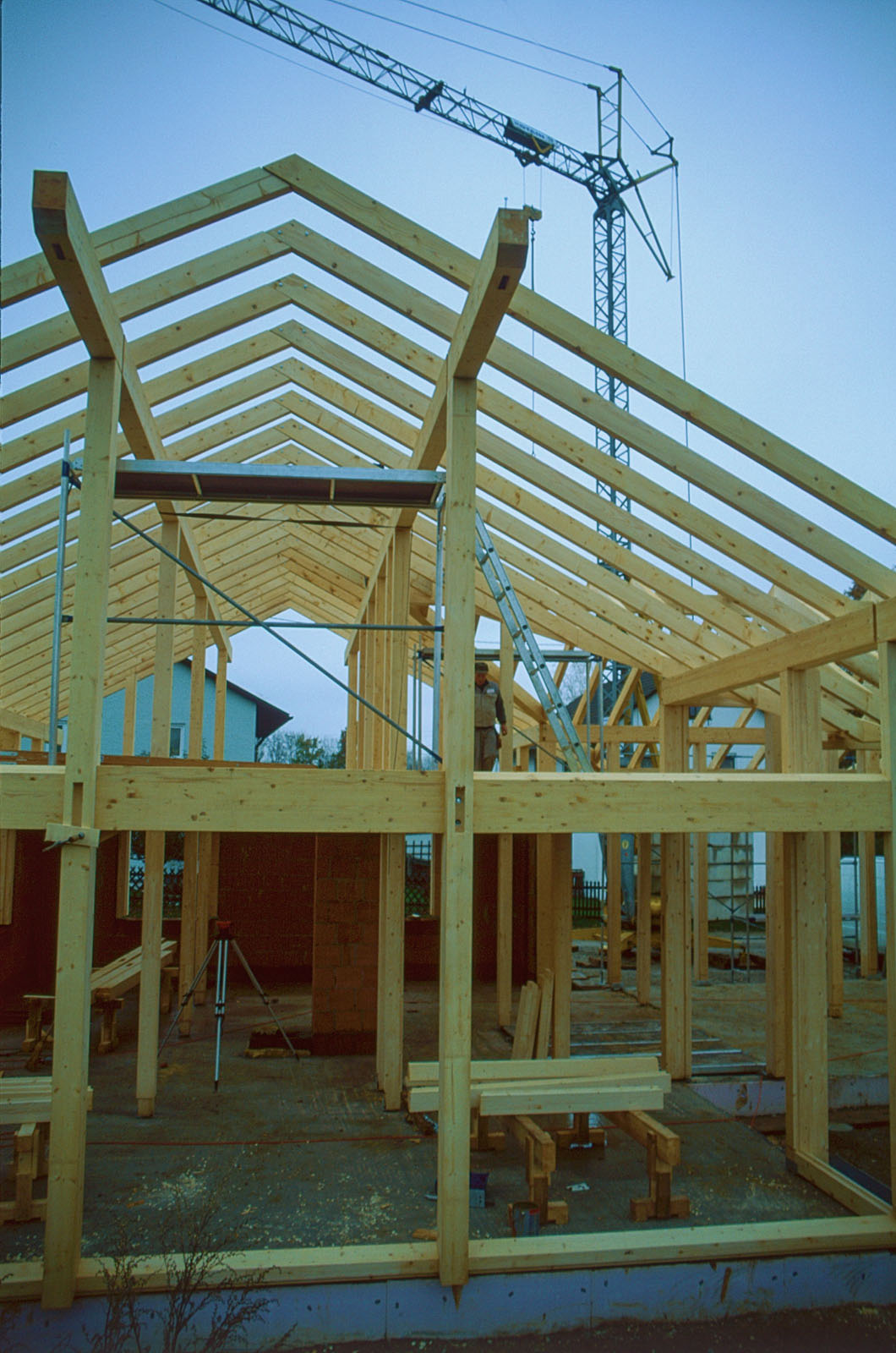 Größten Dank an meinen Freund und besten Zimmerermeister Josef Baumann, der viel zu früh verstorben ist und an seine Mitarbeiter. Es gab einiges an den Missgeschicken der Kellerbauer zu korrigieren. Die Südostecke der Kellerdecke im Wohnhaus war 16cm niedriger als die Nordwestecke, das muss man erst mal schaffen - Kollegen Maurer! - Spezialfüße mussten beim JACOB in Osterhofen gebastelt werden, ansonsten wäre ein Aufstellen des Holz-Skelettes nicht möglich gewesen - und anschließend Tonnen an Fließestrich.