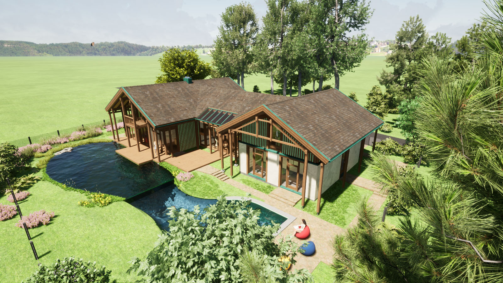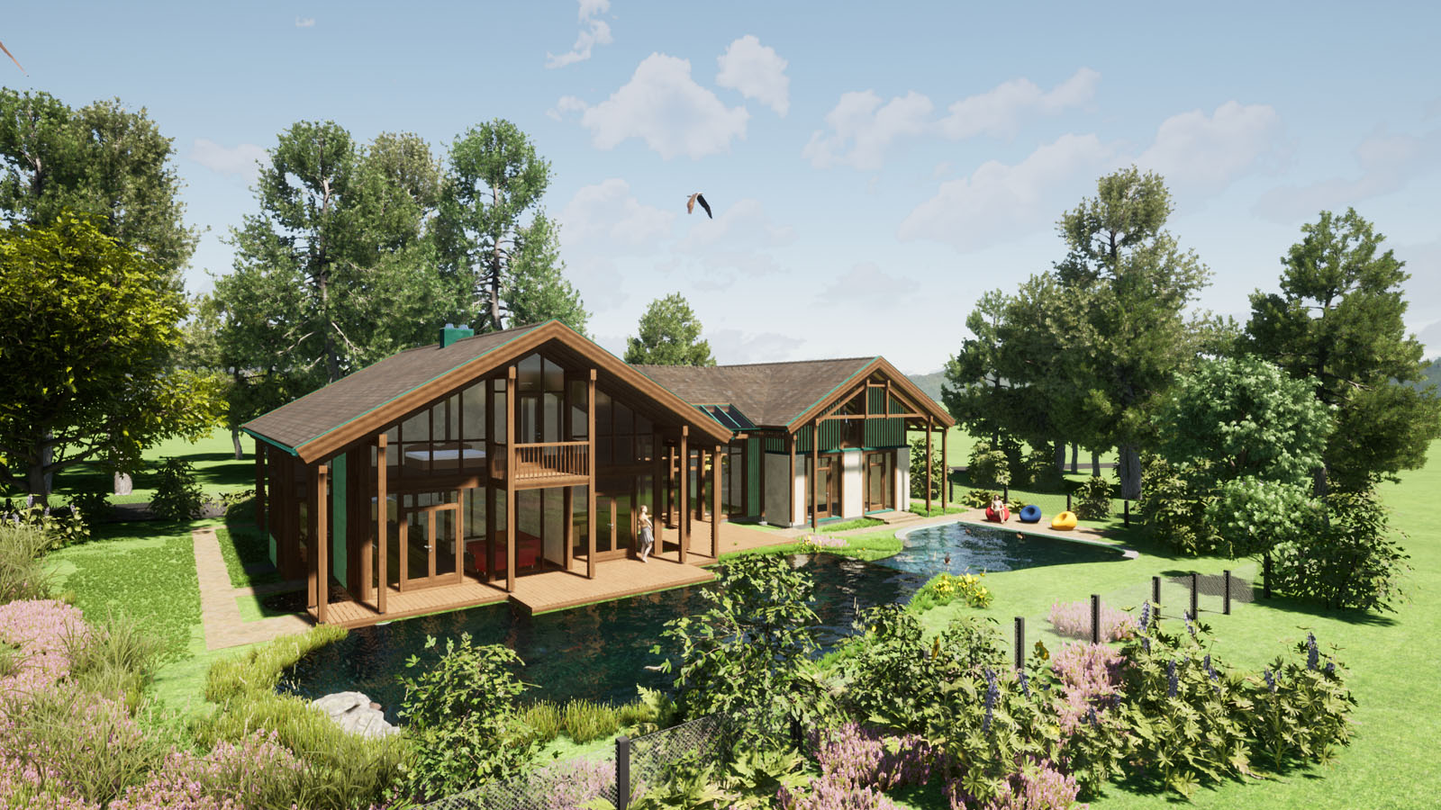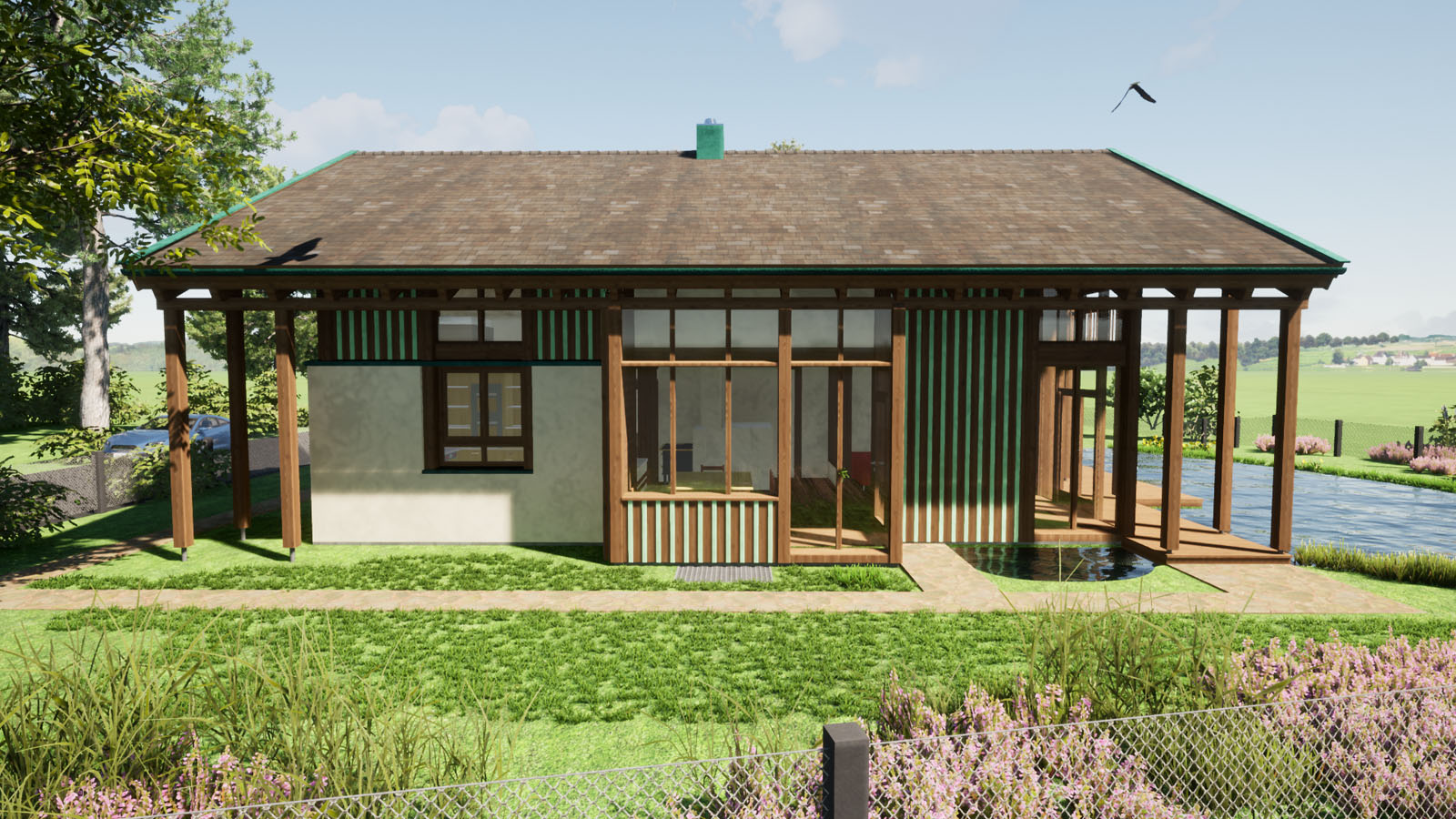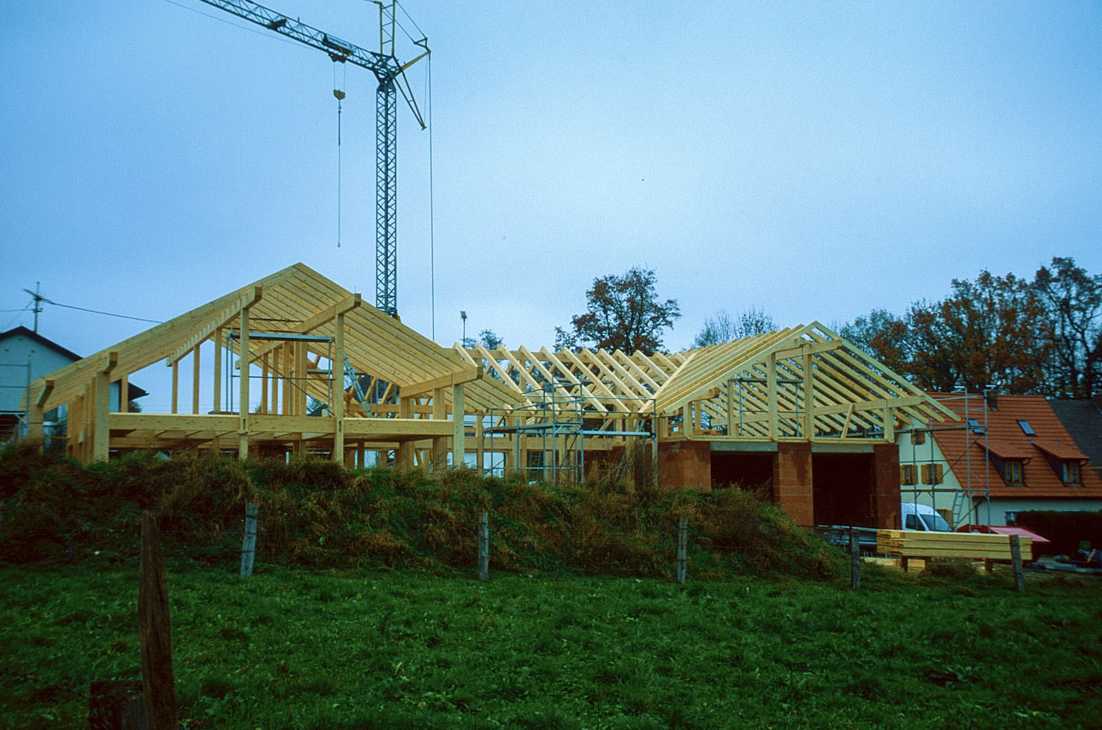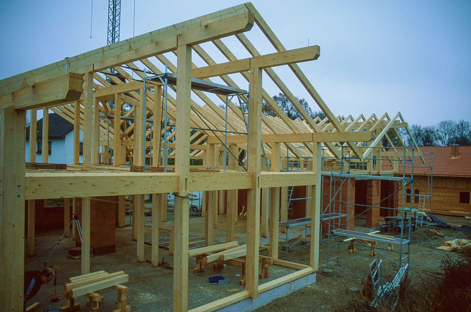 1998 geplant, noch mit AutoCAD 2D, nun im Oktober 2021 in 3D "überführt". 1999 wurde das Projekt realisiert, mit eigenen Händen zimmermannsmäßig mitgearbeitet, im Winter in Aholming in einer Gemüsehalle abgebunden, eiskalt wars, und dann größtenteils als Projektleiter bei Diessen gebaut.