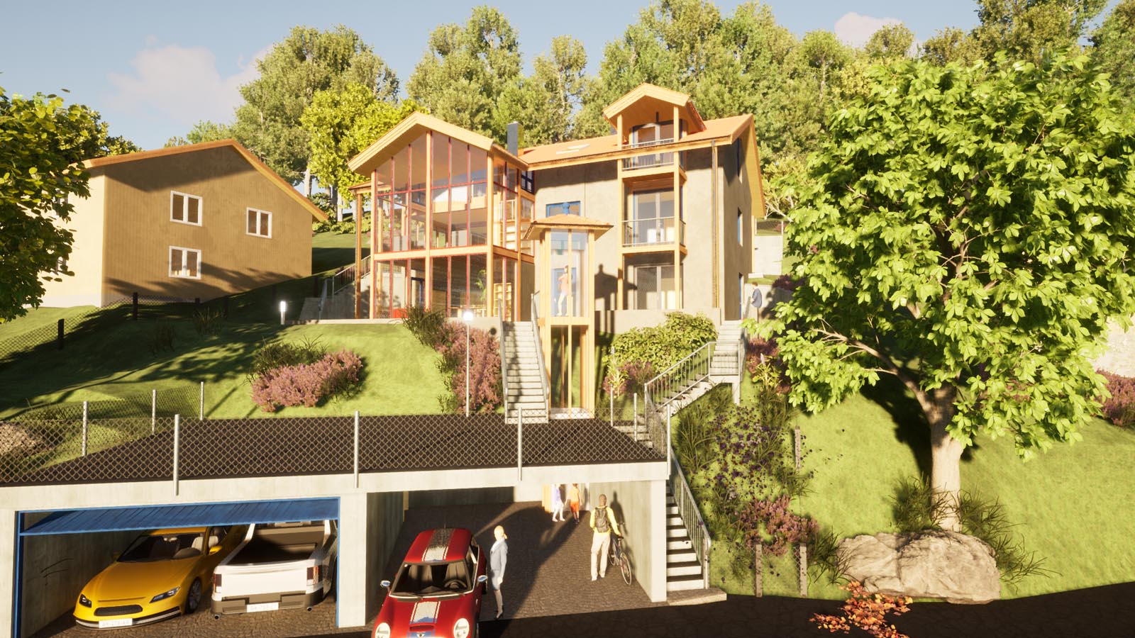 2003 begonnen mit der Planung an einem recht steilen Osthang mit ungeklärten Bodenverhältnissen. Barrierefrei ins Untergeschoss war mein Ziel, deshalb der Hydraulik-Lift im hinteren Eck des Garagengebäudes.