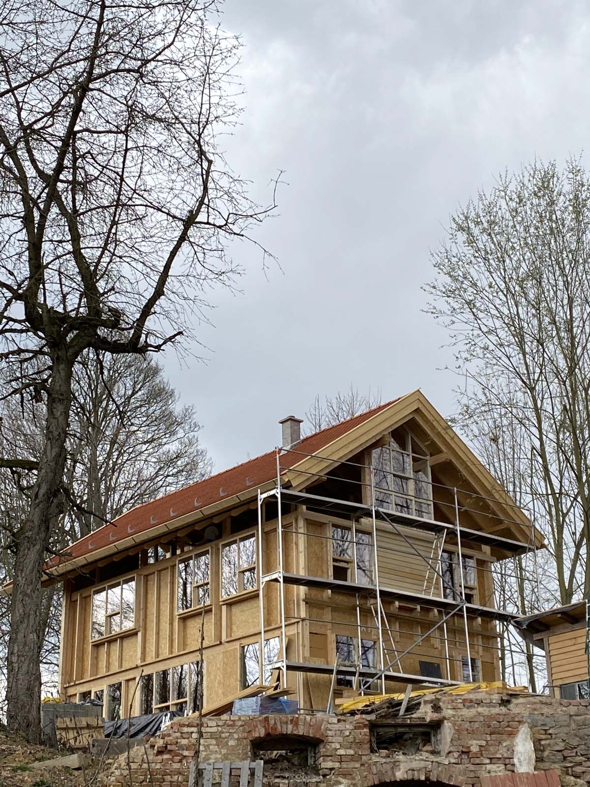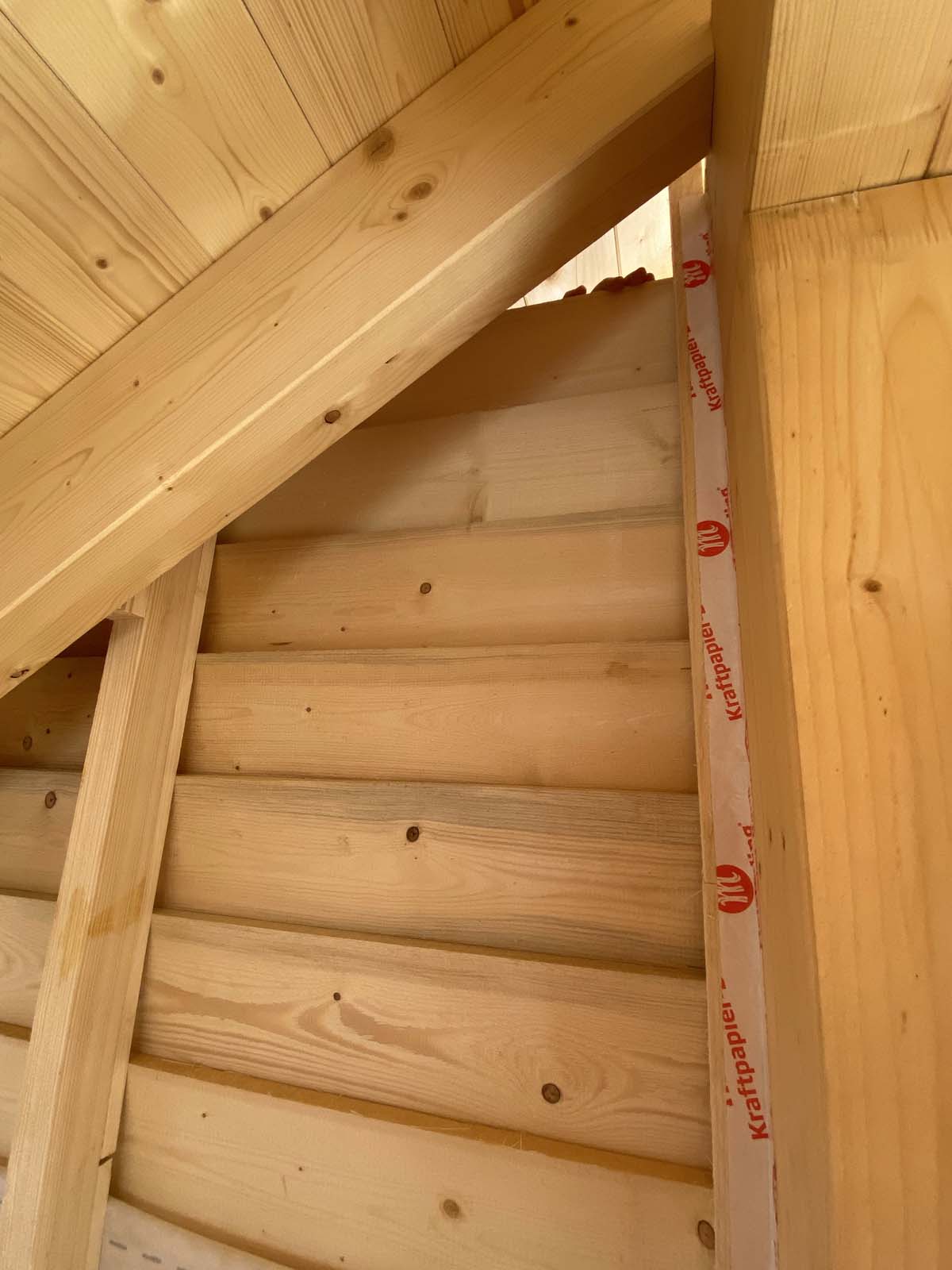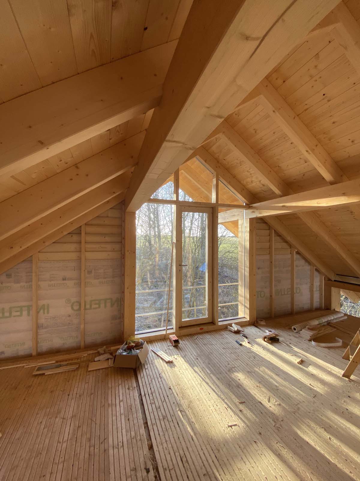 16:45 Uhr - der First für die EG-Anbauten im Osten mit Unterblatt, damit der Südfirst des Gewächshauses sauber befestigt und beide sauber miteinander kraftschlüssig verbunden werden können.