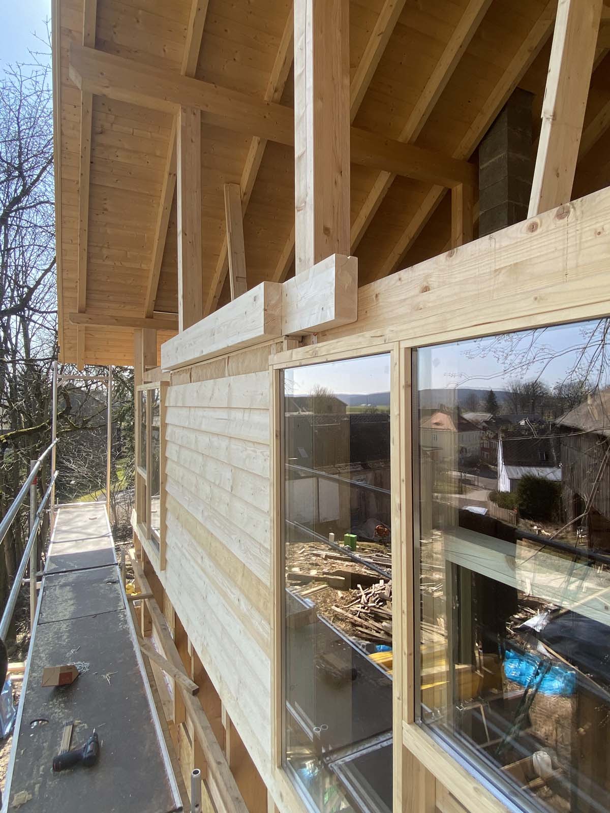 die Westfassade wird fertiggestellt, Glasleisten und Kleinigkeiten, die viel Zeit kosten,