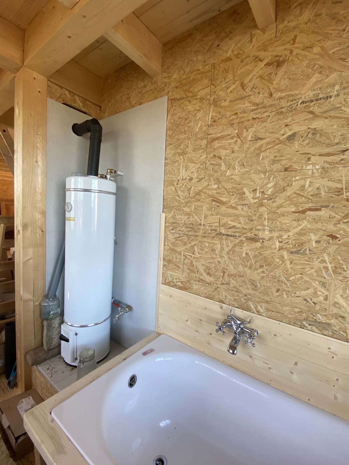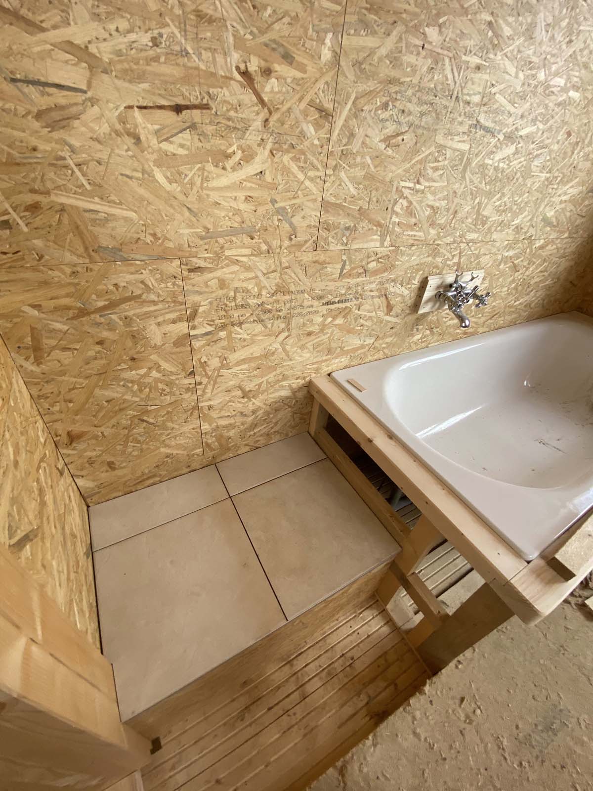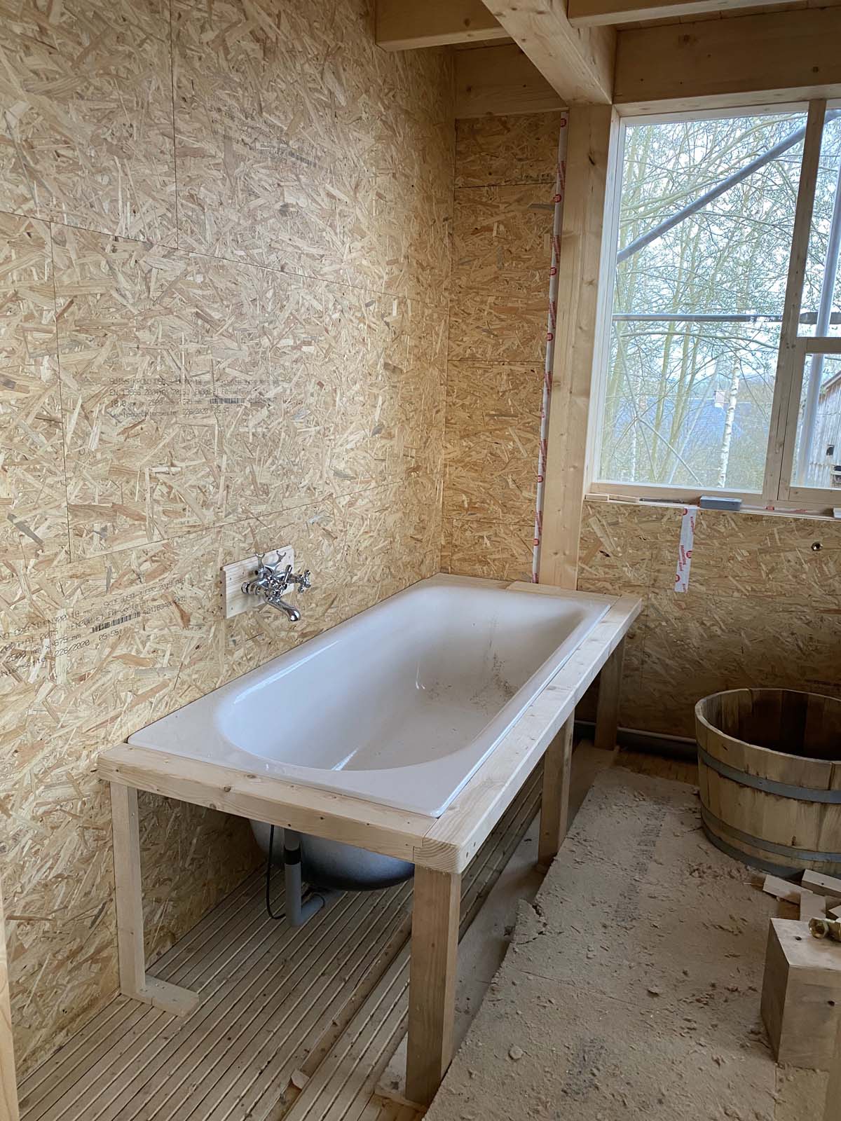das Bad wird benutzbar gemacht und die Fensterchen zwischen die Sparren eingebaut