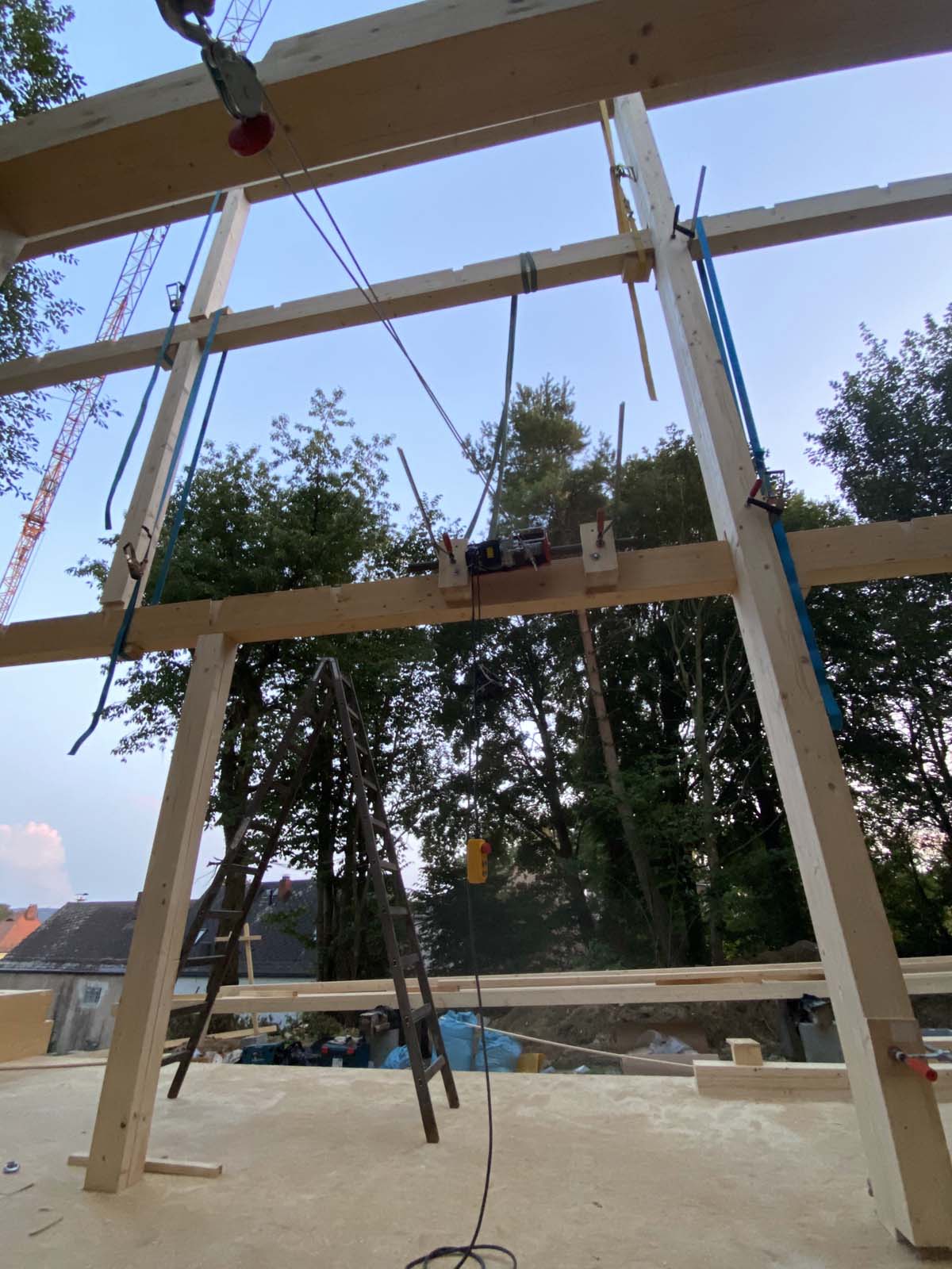 13:45 Uhr - die letzte Wand steht - alles hat trotz falschem Kranstandort und dadurch viel mehr Aufwand geklappt - und ohne Verletzungen