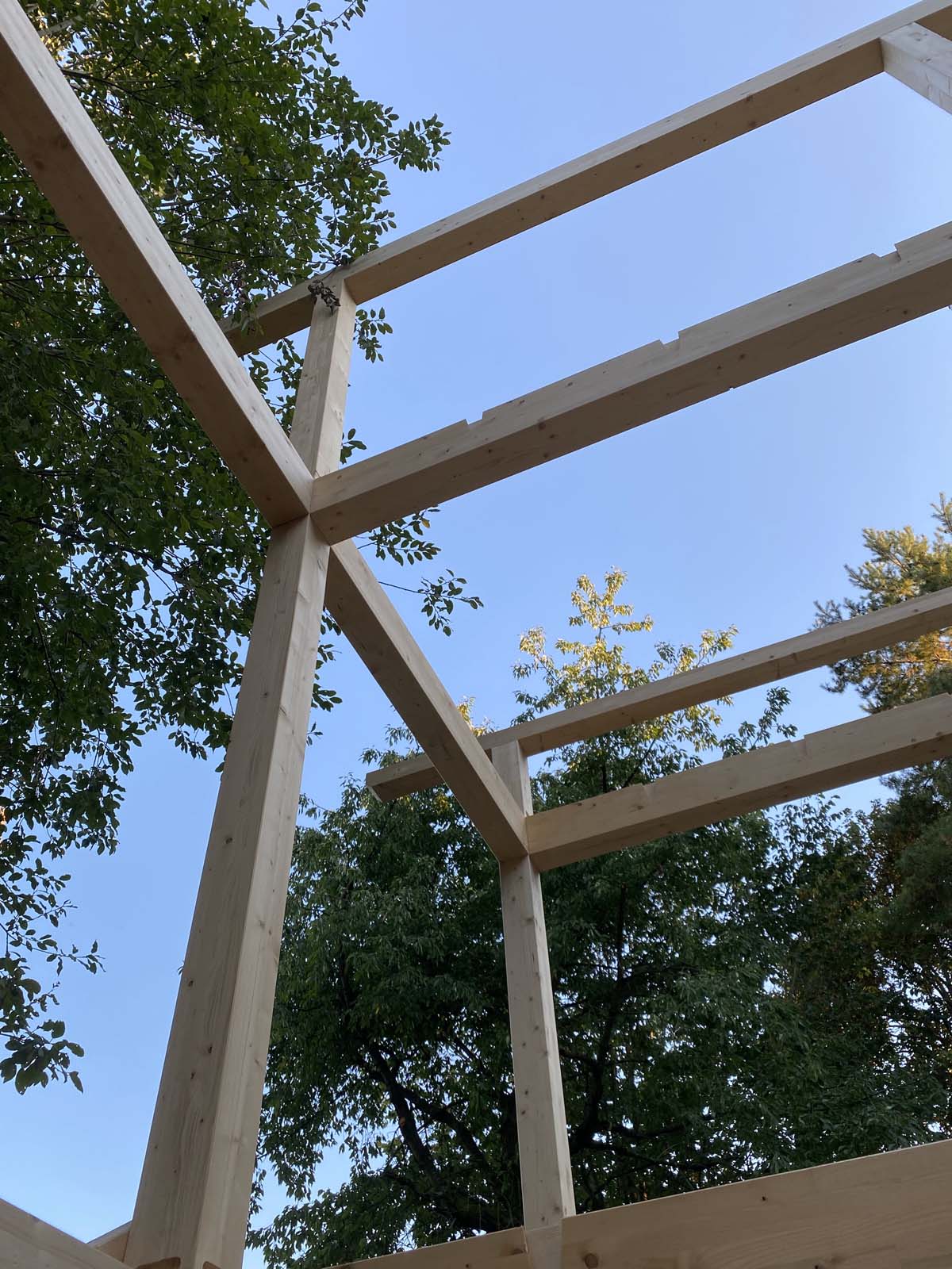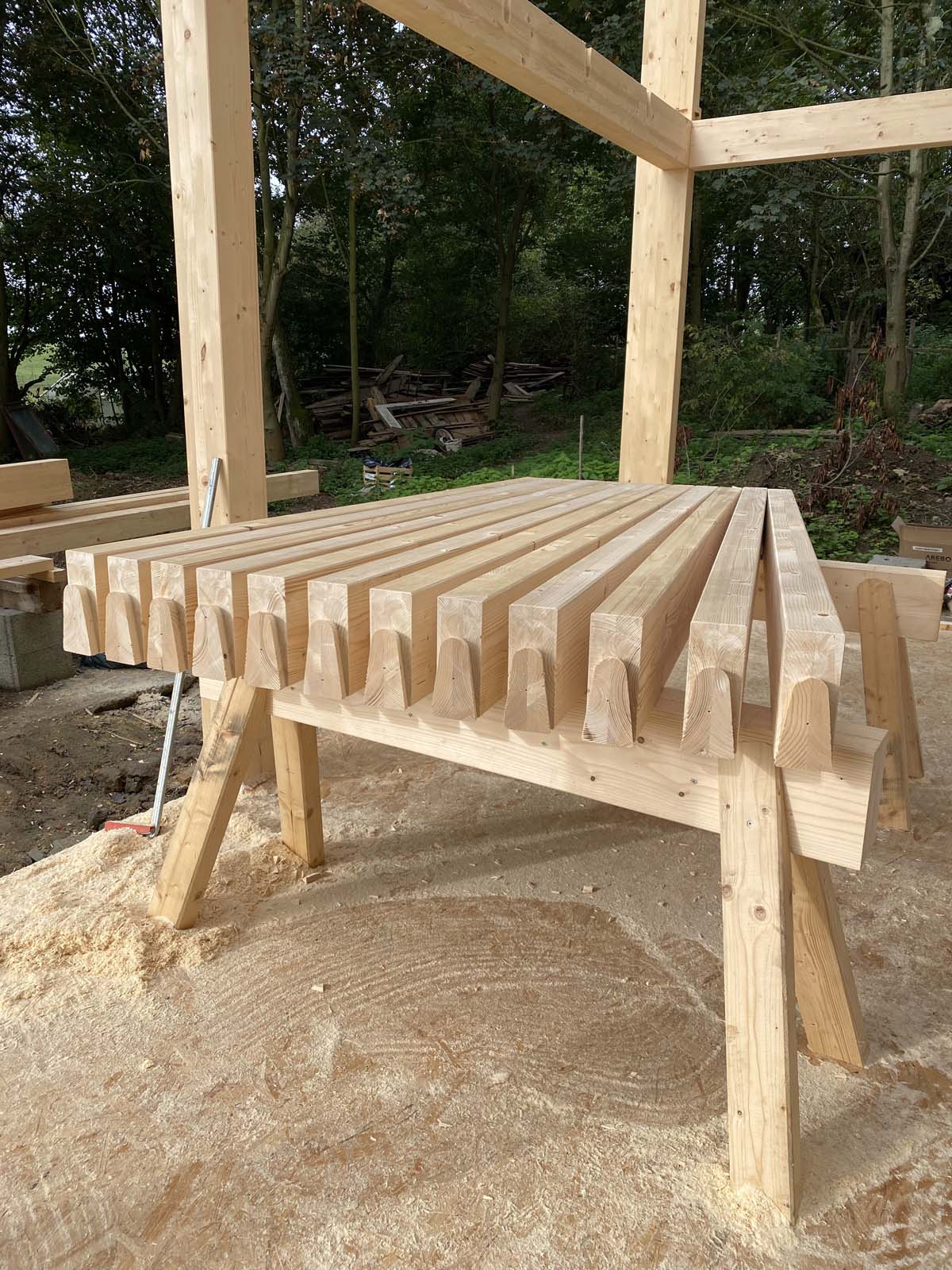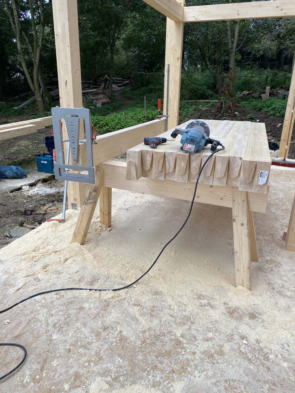 nächste Woche geht es ans Dach, Gerüst aufstellen und Sparren produzieren, das Wetter ist traumhaft für uns - goldener September und auch Oktober
