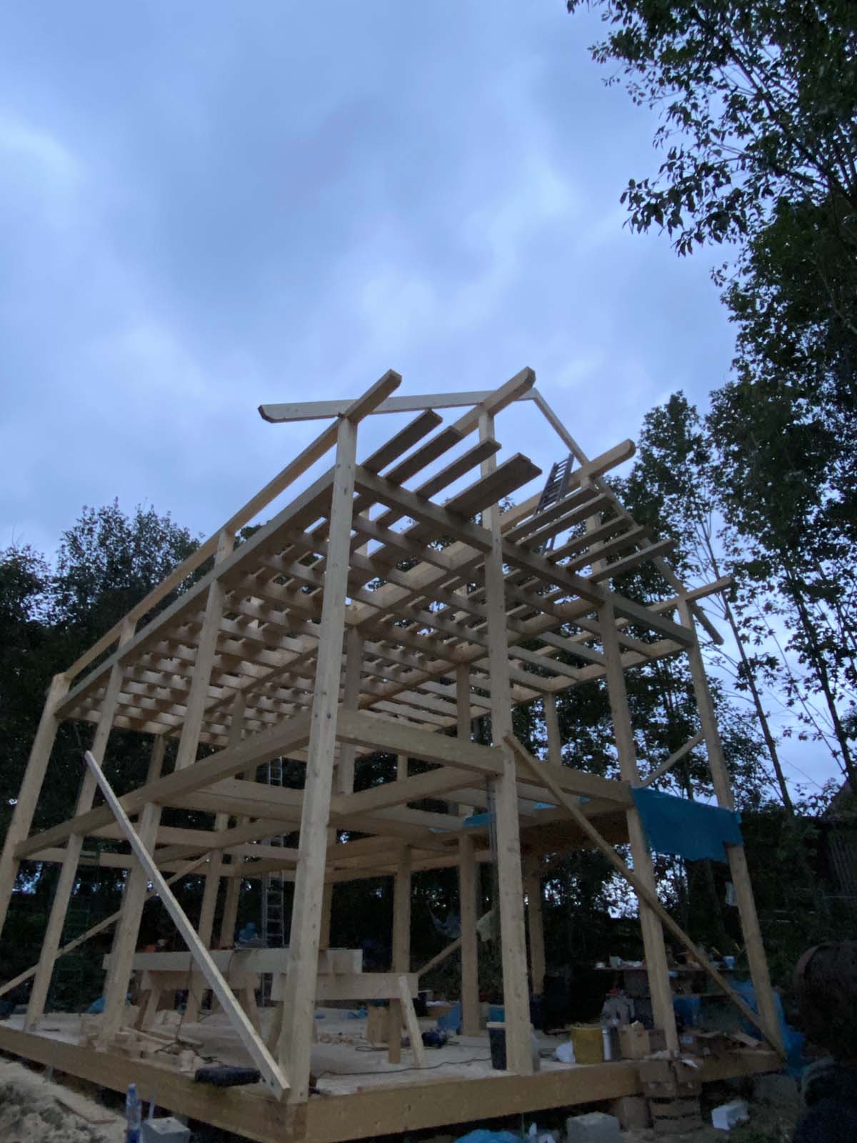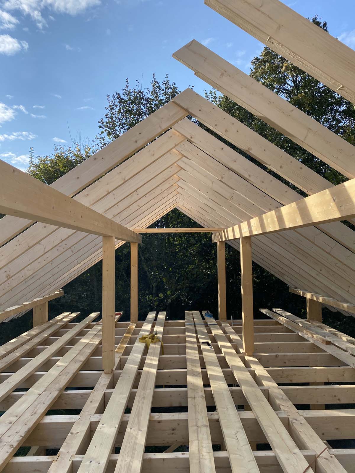nächste Woche kommt das Gerüst und dann wird das Dach eingeschalt, eine ProClima-Dachbahn verlegt, AufDachGedämmt und eingelattet
