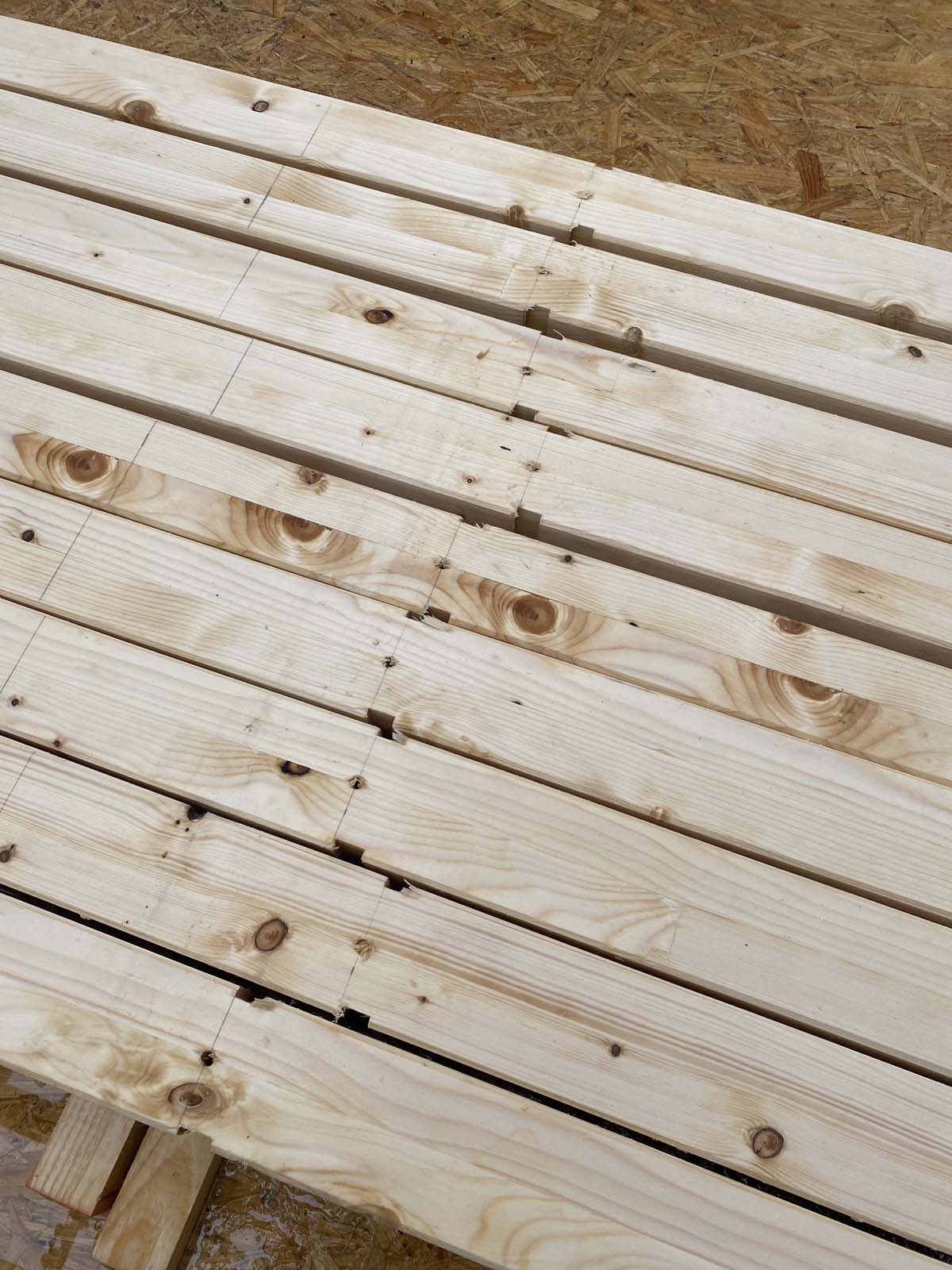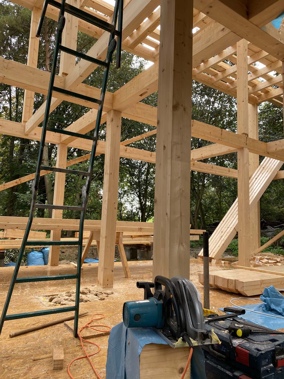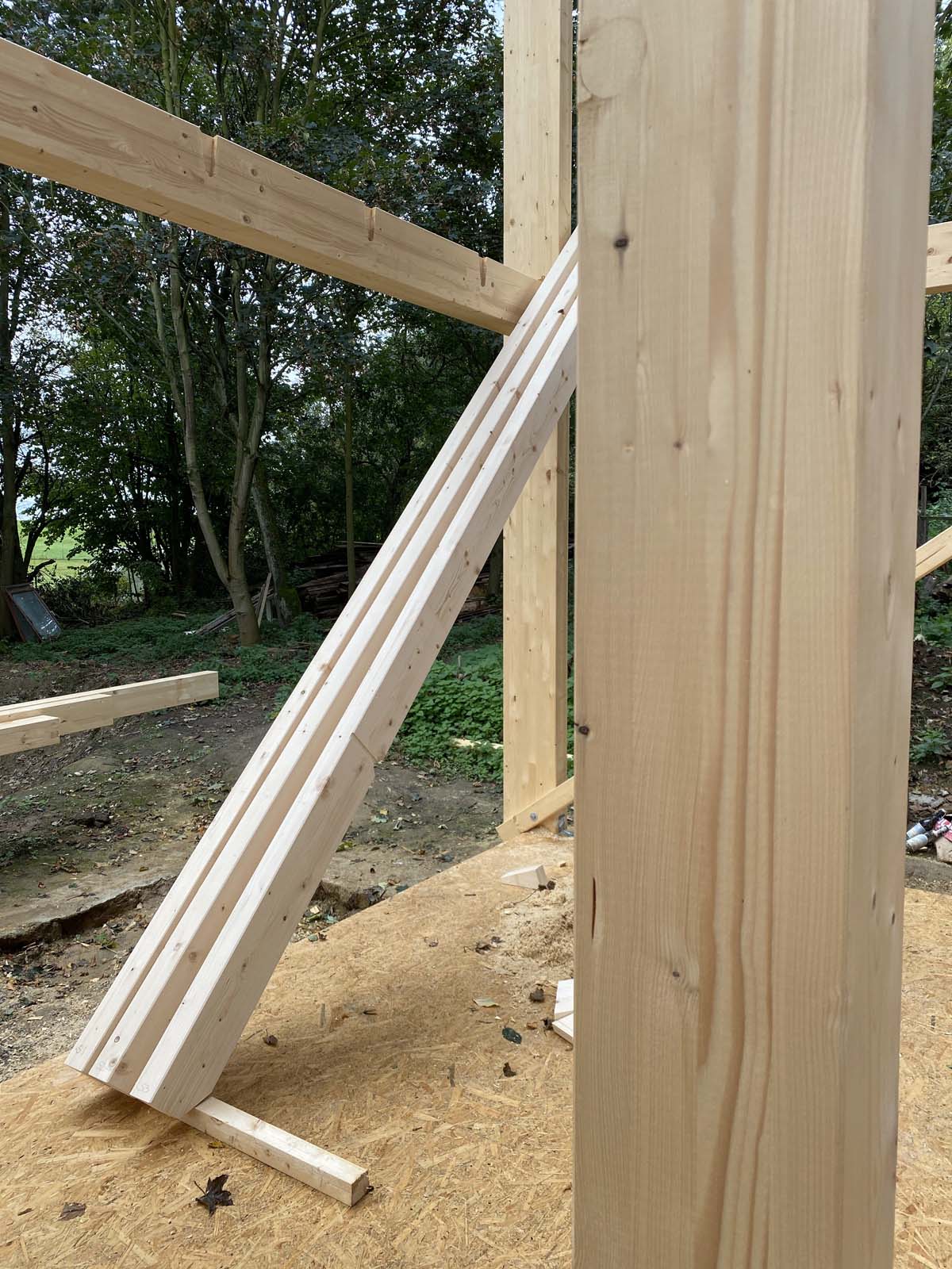 gedämmt wird von außen, später, wenn das Dach drauf ist. Das gesamte Skelett bleibt innen sichtbar, außen teilweise.