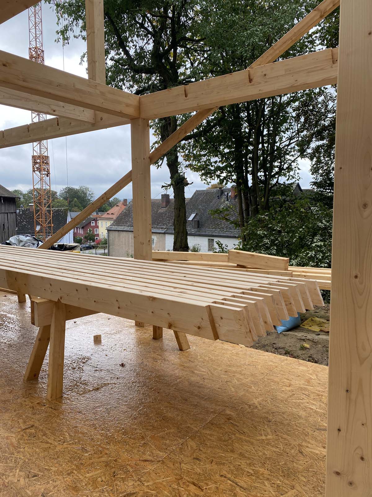 Sparren werden im östlichen Bereich aufgesetzt und dann nach Westen geschoben, leider nicht in der Klaue, denn da stört das Blatt der Nordseite