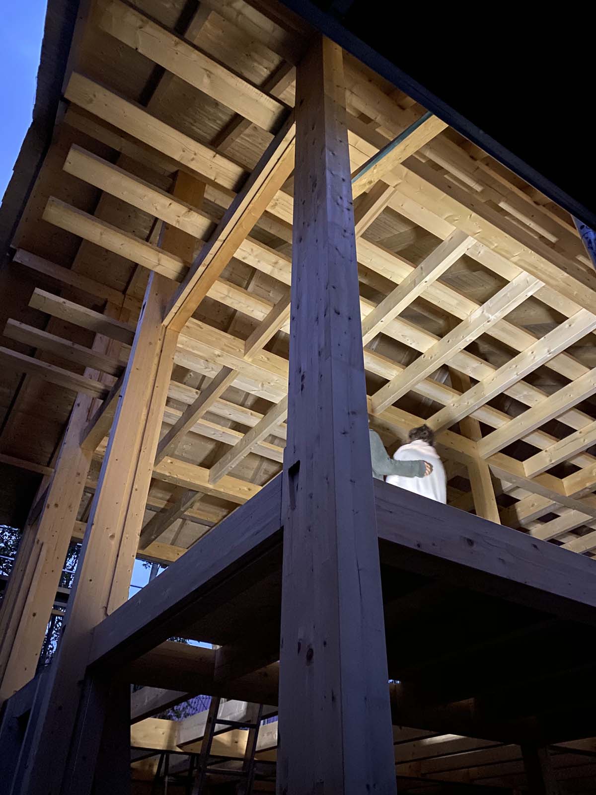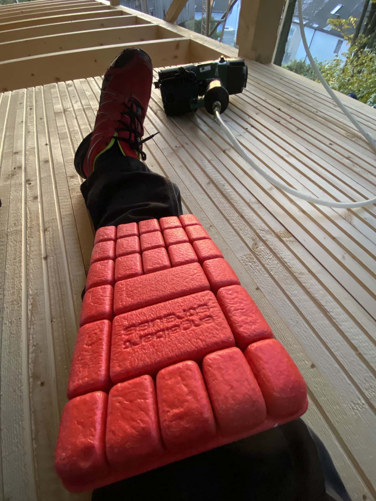 8:30 Uhr - der schwere Bello (Vorschlaghammer) macht seine Arbeit - die Schwalbenschwänze brauchen einige gewichtige Schläge, bis sich die Verbindungen kraftschlüssig schließen